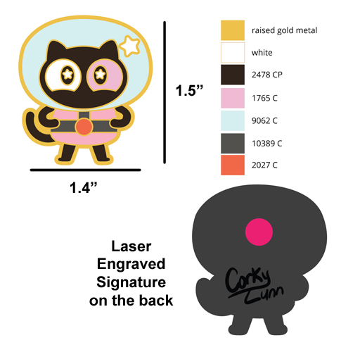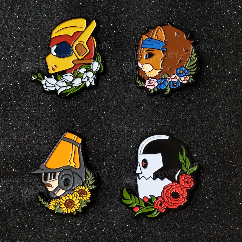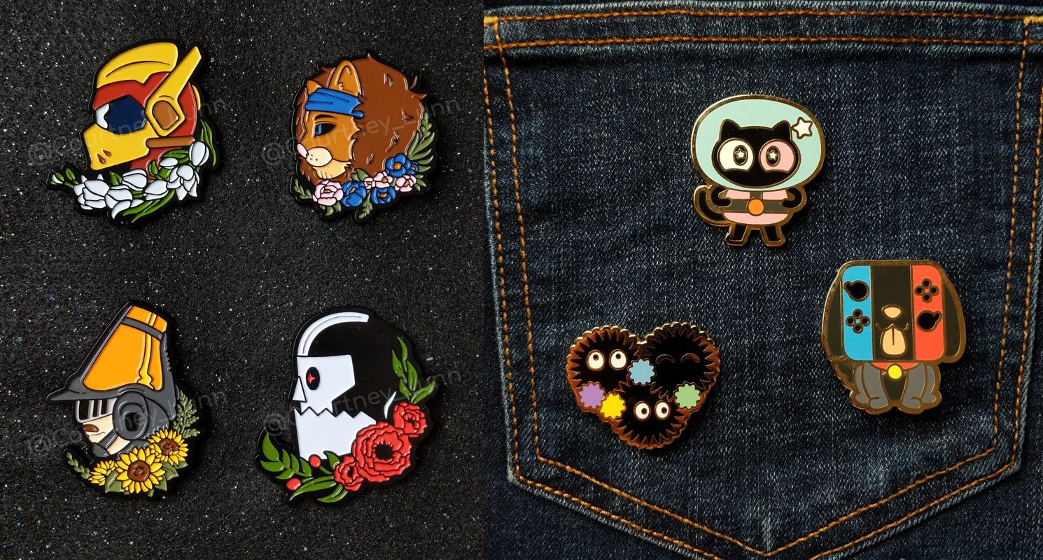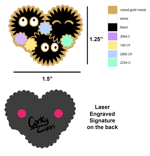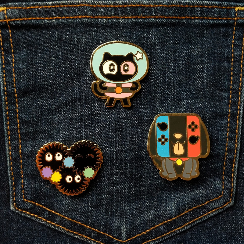 The Cookie Cat, Soot Sprite, and Nintendoggo pins are 1.25"-1.5" tall, made with hard enamel and gold plated metal with 1 or 2 rubber clutches.